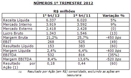 Os resultados da companhia refletem cenário conjuntural desafiador no mercado externo, como já observado no quarto trimestre de 2011. Alguns mercados importantes como Japão e Oriente Médio ainda sofrem processo de ajuste e normalização do nível de estoques, e de fluxos de mercadorias. A receita com exportações foi de R$ 2,4 bilhões no trimestre, praticamente no mesmo patamar comparado com o primeiro trimestre do ano passado.