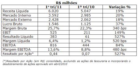 A receita líquida foi de R$ 6 bilhões, 19,3% superior ante o primeiro trimestre de 2010. O lucro bruto atingiu R$ 1,5 bilhão, o que representa crescimento de 37,4%, com margem de 25,7%. Respaldadas pelo ambiente macroeconômico favorável, as vendas no mercado interno aumentaram 20,4% e somaram R$3,6 bilhões. Em volumes, o crescimento chegou a 13%.