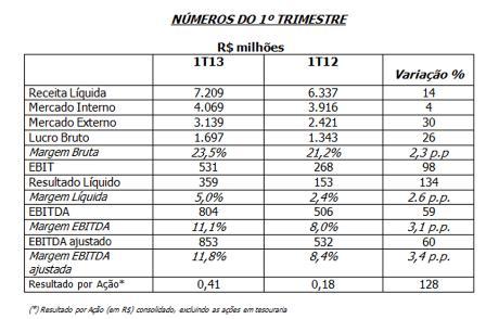 MERCADO INTERNO - As receitas no mercado interno atingiram R$ 3,1 bilhões, aumento de 4,2% na comparação com o 1º trimestre do ano passado. Os preços médios cresceram 12,6%, compensando os custos médios que aumentaram 7,4%, em conseqüência do repasse da inflação e da melhoria do portfólio de produtos de maior valor agregado.