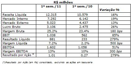 A BRF Brasil Foods fechou o primeiro semestre de 2011 com lucro líquido de R$ 881 milhões, valor 279% superior ante o mesmo período do ano anterior. A receita líquida somou R$ 12,3 bilhões , crescimento de 16%.